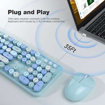 Introducing the MOFII Wireless Keyboard and Mouse Combo, a vibrant and stylish addition to your workspace! This colorful, retro typewriter design keyboard is not just a feast for the eyes with its round keycaps, but it also boasts full-size functionality to enhance your typing experience. Paired with a uniquely designed wireless mouse resembling a cool sports car, this combo brings a dash of fun and aesthetics to computer work, helping you to create an environment of visual beauty and productivity.