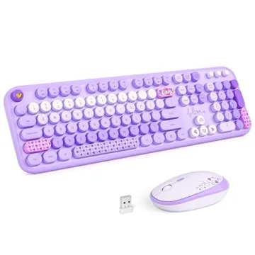 Show more Introducing the MOFII Wireless Keyboard and Mouse Combo, a delightful and vibrant addition to your desktop that seamlessly combines style and functionality. Crafted with retro-inspired round keycaps, this full-size keyboard is not only visually appealing but also offers a nostalgic typing experience reminiscent of classic typewriters. Available in a stunning purple hue that adds a cheerful splash of color to any workspace, this set is designed for comfort and productivity. The ergonomic mouse, paired with the keyboard, allows you to work or game for extended periods without discomfort, ensuring each keystroke feels satisfying and smooth.