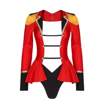 Show more Moggemol Women's Circus Ringmaster Costume Ringleader Cosplay Bodysuit is the ideal outfit for those who wish to steal the spotlight this Halloween! This stunning costume showcases a vibrant red long sleeve bodysuit adorned with eye-catching contrast color patchwork. Its unique design is further accentuated by fringed epaulets and decorative buttons that provide an authentic circus ringmaster look. The convenience of a back zipper closure allows for easy on-and-off access, ensuring you’re party-ready in no time. Crafted with comfort in mind, this costume is perfect for wearing throughout the night as you entertain and dazzle your audience.