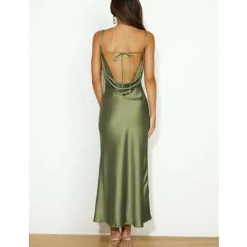 Mogidol Summer Satin Spaghetti Strap Cowl Neck Backless Midi Dress for Women