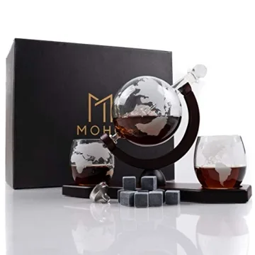 Set on a handsome mahogany-stained wood tray, the decanter is complemented by two elegantly etched glasses that depict a detailed world map. This makes it a perfect fit for anyone who loves travel, adventure, or simply enjoys sipping whiskey in style. To top it all off, the decanter comes with a secure glass stopper that ensures your prized liquor remains fresh and does not evaporate over time.