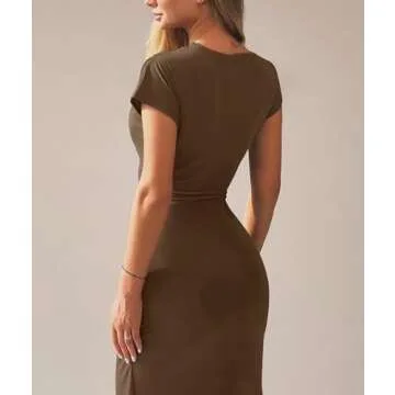 Mojessy Women Bodycon Maxi Dress Sexy Mock Neck Lace Up Bandage Ruched Short Sleeve Long Dress Cocktail Dress Brown