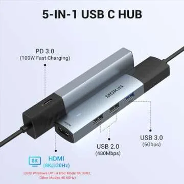 Show more Introducing the revolutionary 5-in-1 USB C Hub, the ultimate accessory for your modern digital lifestyle. This multifunctional adapter lets you connect multiple devices, transforming your workspace into a hub of productivity. With 1 HDMI port capable of stunning 8K resolution, and three USB A ports, you can seamlessly transition between work and play. Say goodbye to the hassle of limited connectivity; with this hub, you can connect your MacBook Pro, iPad Pro, or any USB-C device effortlessly.