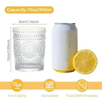 Show more Introducing the MOLADRI Vintage Drinking Glasses Set of 4, a stunning collection of cute textured water glass cups designed to elevate your drinking experience. Each glass, boasting a unique embossed sunflower pattern and adorned with a touch of luxurious gold, sits beautifully in any modern home or outdoor gathering. With a size of 3.1 inches (W) x 3.9 inches (H) and a classic capacity of 10 oz / 300 ml, these retro tumblers are perfect for serving your favorite beverages, from refreshing juices to sophisticated cocktails. Crafted from premium, lead-free food-grade glass material, these sturdy tumblers maintain their shine and elegance even after numerous dishwasher cycles, ensuring they remain a cherished part of your drinkware collection for years to come.