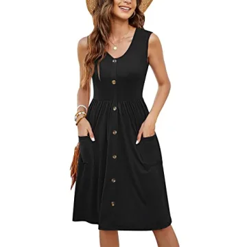 Show moreIntroducing the MOLERANI Women Summer Dresses Sleeveless Casual Loose Swing Button Down Midi Dress, designed to keep you stylish and comfortable all summer long. Tailored from a lightweight and soft fabric, this dress provides exceptional comfort against your skin, making it perfect for warm weather. With its elegant V-neckline accented by decorative buttons, this charming midi dress effortlessly blends functionality with fashionable appeal. The swingy A-line silhouette not only enhances your figure but also allows for easy movement, ensuring you stay breezy and chic throughout your day. The lovely black hue of this dress renders it a versatile addition to your wardrobe, making it suitable for various occasions.