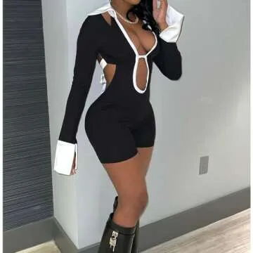 Show moreIntroducing the Molilove Women's Sexy Deep V Hollow Out Shirt Collar Long Sleeve Backless Strap Tight Jumpsuit Shorts Clubwear – an exquisite piece that oozes confidence and style. Crafted from a blend of 95% Polyester and 5% Spandex, this one-piece jumpsuit is designed to provide ultimate comfort while showcasing your stunning silhouette. The combination of long sleeves with a daring deep V neckline adds a touch of sexiness to your wardrobe, making it perfect for any occasion. With its backless straps design, this jumpsuit not only highlights your curves but also ensures you stay cool and stylish. Whether you're heading out for a night on the town or a casual day out, this jumpsuit will have you turning heads and receiving compliments all night long.