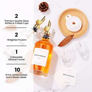 Show more The Molimoli 350ml/11.8 Oz Mouthwash Dispenser is your perfect bathroom companion for that sleek, organized look while ensuring your mouthwash is stored safely and stylishly. This complete set includes two elegant glass bottles, each holding 11.8 oz, outfitted with a silicone funnel for easy filling, two metal pour spouts for controlled dispensing, and two 25ml cups for accurate dosing. With a design that effortlessly blends into your bathroom decor, this mouthwash decanter not only maintains the cleanliness of your mouthwash but does so with eco-friendly materials that promote sustainability.