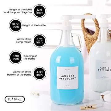 Show more Transform your laundry experience with our elegant set of two 64 oz glass bottles, perfect for dispensing laundry detergent and fabric softener. This premium set seamlessly blends style and functionality, featuring Scandinavian and minimalist-inspired designs that elevate any laundry room decor.