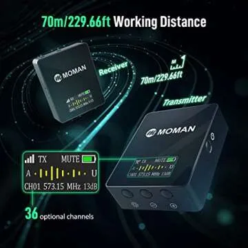 Show more Introducing the Moman C1 Professional UHF Wireless Lavalier Microphone System—the ultimate solution for anyone seeking high-quality audio capture. With an impressive working distance of up to 70m/229.66ft and 36 optional channels, this wireless lapel microphone system ensures zero latency recording, making it perfect for various applications such as interviews, vlogs, teaching, and presentations. Its robust design blends seamlessly with your audio gear, offering both performance and versatility.