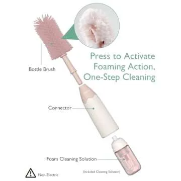 Show more Introducing the revolutionary First Bubble-Producing Cleaning Brush from Momcozy, designed to transform your bottle cleaning experience with cutting-edge technology. This innovative product features a press-to-foam silicone brush that ensures dense foam for a thorough clean. Wave goodbye to ineffective brushes that don't foam properly! With ultra-soft silicone bristles, this cleaning brush is gentle on all surfaces, providing a scratch-free clean for your bottles and breast pump parts.