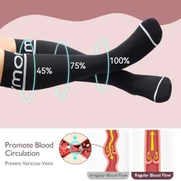 Show more Discover the ultimate in comfort and support with the Momcozy Compression Socks for Women. These knee-high compression socks are expertly designed to provide 15-20 mmHg graduated compression, making them a fantastic choice for anyone facing long hours on their feet. Whether you're a busy professional, expecting, or an avid traveler, these socks are tailored to promote circulation and reduce swelling, significantly enhancing your day-to-day comfort. Crafted with high-quality materials, they beautifully blend functionality with style, ensuring you can wear them all day without sacrificing comfort or appeal.