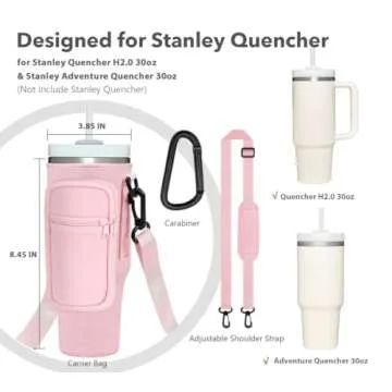 Show more This versatile and stylish 30 oz Stanley Tumbler Carrier Bag is the perfect accessory for outdoor and daily use. Designed specifically to fit the popular Stanley 30 oz tumbler with handle, this carrier bag not only provides a snug fit but also enhances the look of your tumbler with its fine stitching and high-quality neoprene material. Whether you are hiking, commuting, or just enjoying a day at the beach, this carrier bag makes transporting your cup effortless.