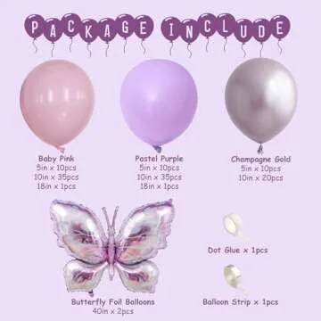 The kit showcases a blend of premium quality balloons, including striking 40-inch butterfly foil balloons, alongside assorted sizes of purple, baby pink, and champagne gold latex balloons. Crafted from 100% natural latex, these balloons are thicker and more durable, significantly reducing the risk of bursting while you party. The vibrant colors and rich hues ensure a captivating backdrop that will delight guests of all ages, making every occasion special and memorable.