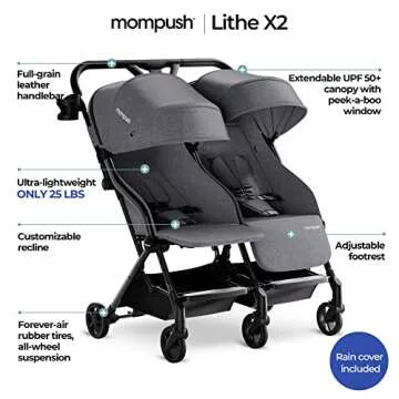 Mompush Lithe Double Ultralight Stroller, Lightweight Side by Side Stroller, Two Large Seats with Individual Recline, Easy Fold Twin Stroller