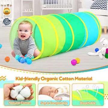 Show more Introducing the ultimate playground accessory for your little ones: a vibrant and entertaining Kids Tunnel that promises hours of fun and developmental play! Crafted from premium organic cotton, this tunnel is not only safe but exceptionally soft and comfortable, allowing children to explore their adventurous sides without compromising on safety. With ASTM certification, parents can have peace of mind knowing that their kids are playing in a secure environment.