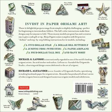Show more Unleash your creativity and learn the art of origami with the Origami Money Kit! This unique kit, designed by renowned origami artist Michael LaFosse, provides an engaging way to transform ordinary bills into beautiful creations. Perfect for both beginners and experienced crafters, the kit includes everything you need to get started on your origami journey, including detailed instructions and a variety of practice options.
