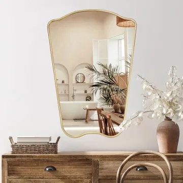 Show moreThis exquisite wall mirror is a stunning piece from the MONJITA collection, designed to infuse elegance and style into any room. Measuring 32'' x 23'', its unique irregular shape serves as a captivating focal point while enhancing the sense of space and brightness in your home. The mirror is not just a simple reflective surface; it’s an art piece that draws the eye and sparks admiration from your guests. Crafted with a solid wood frame in a sophisticated gold finish, this mirror boasts high-quality construction that ensures durability and long-lasting beauty.