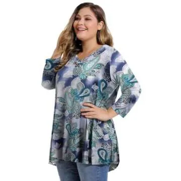 MONNURO Womens Plus Size 3/4 Sleeve V Neck Button Casual Loose Flowy Swing Tunic Tops Basic Tee Shirts for Leggings