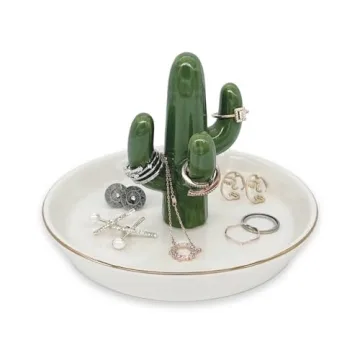 Measuring approximately 5.1 inches in diameter and standing at 3.9 inches high, it is the ideal size to fit on dressers, nightstands, bathroom counters, or even kitchen spaces. Its versatile design allows it to complement your home decor while keeping your valuables secure during those times when you wash dishes or take a shower. Customers rave about its compact size and adorable cactus design, making it a must-have accessory for anyone looking to enhance their space.