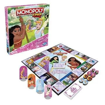 Show more Step into the enchanting world of Disney with the Monopoly Hasbro Gaming Junior: Disney Princess Edition. Designed for kids ages 5 and up, this delightful board game transports young players on a magical adventure featuring beloved Disney Princesses like Cinderella, Moana, Mulan, and Rapunzel. The game board immerses players in unforgettable scenes, such as Mulan becoming Ping, Moana meeting Maui, and Rapunzel's memorable flying lanterns. With its vibrant illustrations and engaging gameplay, this version of Monopoly presents a kid-friendly introduction to the classic game that promotes fun family bonding.