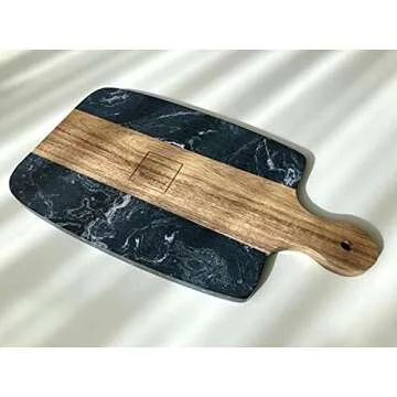 Show more Introducing the Monowood Premium Acacia Wood & Black Stone Cheese Board, a luxurious addition to your kitchen or dining experience. This beautifully crafted board combines the rich, natural hues of Acacia wood with striking black stone accents, making it not just a serving piece but a true work of art. With dimensions of 13 x 7 inches, it’s the perfect size for entertaining guests or simply elevating your everyday meals. Imagine serving your favorite cheeses, meats, fruits, and vegetables on a board that has been designed to impress! Its modest weight ensures stability while cutting or serving, providing both style and functionality.