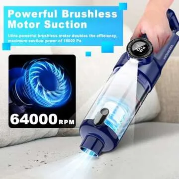 Show more Introducing the MONOZEL Car Vacuum Portable Cordless – the ultimate handheld solution designed for exceptional cleaning efficiency and convenience. This state-of-the-art vacuum features an upgraded brushless motor that delivers an impressive 15000Pa suction power in Max mode, ensuring no dust or debris is left behind. For lighter tasks, switch to Eco mode (10000Pa) for effortless cleaning. Whether it's pet hair on your carpet or crumbs in the kitchen, this powerful vacuum cleaner is your reliable partner for maintaining a spotless environment.
