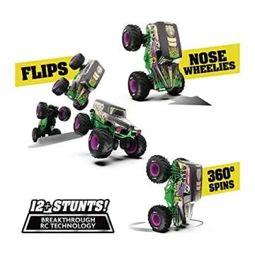Show more Experience the thrill of remote-controlled adventures with the Grave Digger Freestyle Force RC Truck by Spin Master! This revolutionary vehicle boasts dual optical sensors that allow drivers of all ages to perform incredible nose and tail wheelies. Ideal for both novice and advanced users, this RC truck offers two modes: beginner for simple push-button stunts, and advanced for those seeking total control at 100% power. Whether you're executing jaw-dropping 360 spins, epic jumps, or mastering 12 incredible stunts, this truck is sure to impress!