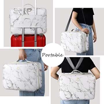 Crafted with high-quality materials to withstand daily use on-the-go, this travel case with a comfortable shoulder strap and sturdy handle makes carrying your cosmetics a breeze. Durable zippers and a chic exterior make this bag as stylish as it is functional, ensuring that you make a statement while you travel. Whether you are a makeup artist on location, a student, or a beauty lover at home, this makeup case is bound to impress.