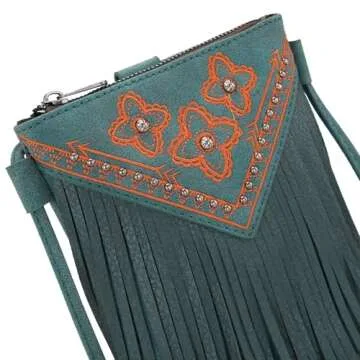 Show more If you're looking for the perfect blend of style and functionality, look no further than the Montana West Crossbody Purse for Women. Part of the American Bling by Montana West western collection, this purse features an exquisite design complete with enticing leather fringe, silver studs, and elegant embroidered details that all speak to its craftsmanship. Measuring at a compact size of 6.5"(L) x 1.5"(W) x 7.5"(H), it’s ideal for those on-the-go moments when you need just the essentials. It not only makes a bold fashion statement but is practical enough to fit your phone and small wallet comfortably, thanks to its thoughtful design.