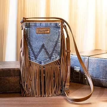 Show moreIntroducing the Montana West Wrangler Back Pocket Fringe Crossbody – the perfect blend of style and functionality designed for the modern western lifestyle. Inspired by the iconic Wrangler jeans, this bag beautifully incorporates the signature hip-pocket design, allowing you to carry a piece of classic Americana with you wherever you go. Crafted from a combination of denim and vegan leather, paired with genuine leather fringe, this purse not only exudes a chic bohemian vibe but also ensures durability and versatility for everyday use.
