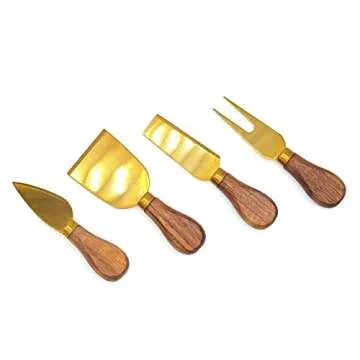 Show more Indulge in elegance with this exquisite set of 4 cheese knives, featuring stunning rich black walnut handles that add a touch of sophistication to any gathering. The gold plated blades not only enhance the visual appeal but also ensure cutting is a breeze, making this set perfect for both casual and formal occasions. Designed for the gourmet in mind, these utensils are not just tools but a statement piece for your charcuterie boards. Each knife is beautifully crafted to provide an exceptional experience, effortlessly complementing the cheese and charcuterie offerings it serves. Whether you're hosting a gathering or enjoying a quiet evening at home, this set elevates the culinary experience. A perfect gift for those who appreciate the finer things in life, the set comes beautifully packaged, making it an ideal choice for gifting.