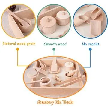 Show more Introducing the ultimate solution to sensory play for toddlers! Our Wooden Sensory Bin Tools are crafted to stimulate your child's fine motor skills while offering endless fun and exploration. Made from high-quality beech wood, these tools feature smooth surfaces and edges, ensuring a safe and enjoyable play experience. Each set includes 14 unique tools, including tongs and containers that are perfectly sized for little hands, encouraging toddlers to grasp, move, pour, and scoop.
