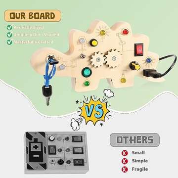 Unlike other sensory toys in the market, the Montessori Toys Busy Board incorporates elements that not only entertain but also educate. Many competitors focus solely on fun aspects, often neglecting developmental benefits. This busy board's LED light feature is unique and enhances the overall play experience, making learning exciting and visually stimulating.