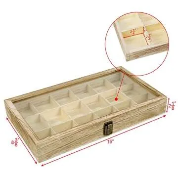 Show moreDiscover the MOOCA Wooden Jewelry Display Case, an elegantly designed storage solution that seamlessly blends functionality with style. Crafted with a natural wood finish and a tempered glass lid, this display case is perfect for showcasing your cherished jewelry collection or rock specimens. With 18 spacious compartments, you can organize earrings, rings, pins, bracelets, and all your treasured keepsakes in one refined space. Elevate your organization and decor with a piece that not only stores but also displays your accessories beautifully.