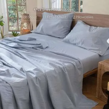 Each set comes with four pieces, including a flat sheet, fitted sheet, and two pillowcases, making it comprehensive for a restful night’s sleep. The fitted sheet boasts a remarkable deep pocket design that accommodates mattresses up to 17”, ensuring a snug fit that won’t come loose during the night. The set’s texture resembles linen but keeps the softness of cotton, providing a lived-in, slightly wrinkled look that adds character to your bedding.