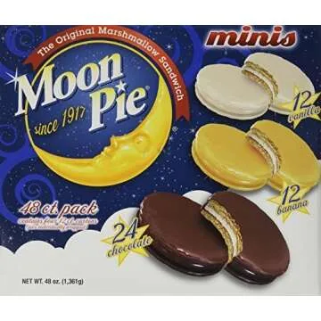 Show moreIndulge in a nostalgic treat that has delighted generations—Moon Pies! These delightful snacks have a rich history and are perfect for anyone seeking a taste of the South. Made with a deliciously soft layer of marshmallow filling sandwiched between two graham cracker cookies, all coated in a luscious chocolate or vanilla glaze, Moon Pies offer a unique treat that’s sure to please both young and old alike. Ideal for festive celebrations, cozy get-togethers, or just a simple snack, they bring a hint of joy in every bite. Moon Pies are perfect for sharing, making them a great addition to any gathering. They even work well as treats for themed parties, including space-themed celebrations, guaranteed to lift spirits and ignite joy!