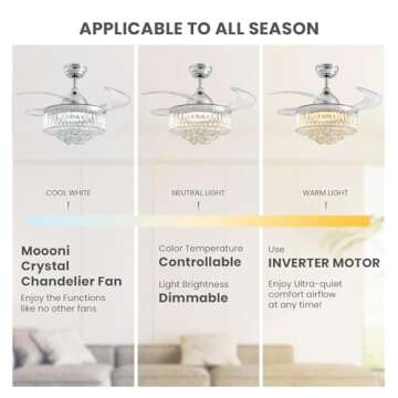 Introducing the Moooni Dimmable Fandelier Crystal Ceiling Fan with Lights, a stunning fusion of elegance and functionality that redefines your living space. This modern invisible retractable chandelier fan features a sleek polished chrome finish, blending seamlessly into any decor style, while providing year-round comfort. Featuring a dimmable 72-watt LED panel light, the brightness is adjustable from a warm 2700K to a cool 6000K, allowing you to create the perfect ambiance for any occasion. With its innovative...