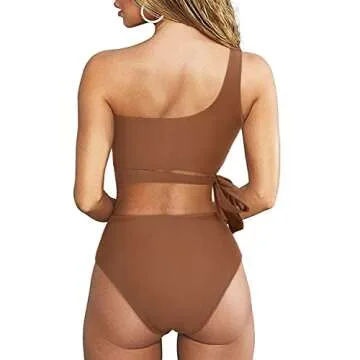 MOOSLOVER Women One Shoulder High Waisted Bikini Tie High Cut Two Piece Swimsuits(L,Coffee)