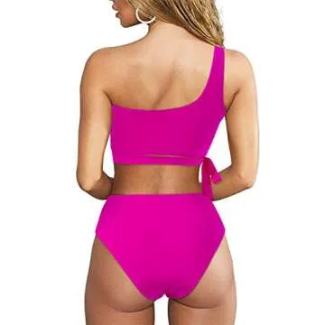 MOOSLOVER Women One Shoulder High Waisted Bikini Tie High Cut Two Piece Swimsuits(S,Rose Red)