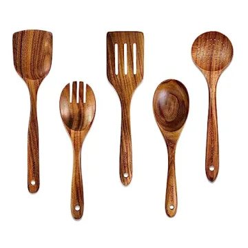 The unique properties of teak wood set this utensil set apart. Known for its density and strength, teak is one of the most durable materials available, making it stronger than silicone or bamboo alternatives. It will not crack easily, ensuring a long-lasting kitchen companion that can withstand the rigors of everyday use. Plus, cleaning is a breeze; simply wash them in warm, soapy water and hang them up for a quick drying process thanks to the convenient holes in each utensil's handle.