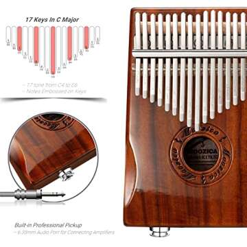 Step into the magical world of music with the Moozica 17-Key EQ Kalimba, a sophisticated and expertly crafted thumb piano that seamlessly blends traditional charm with modern functionality. Made from premium Acacia Koa wood, each kalimba is designed to resonate beautifully, producing bright tones and a rich echo that elevates your musical experience. Its high-gloss finish not only highlights the instrument's aesthetic appeal but also promises durability against everyday wear...