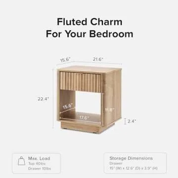 Measuring 21.6 (W) x 15.6 (D) x 22.4 (H) inches, the Brooklyn Nightstand combines style with practical functionality. Its open niche is perfect for highlighting your favorite items, while the smoothly gliding drawer provides ample storage for nighttime essentials, keeping them easily accessible. Not only does it enhance your bedroom aesthetics, but it also serves as a versatile side table in your living area, fulfilling various needs.