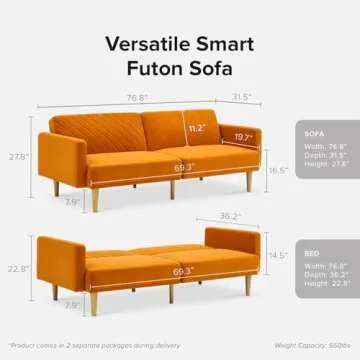 Show more Introducing the ultimate dual-purpose piece for any living space—the versatile futon sofa. This modern creation expertly combines functionality with style, making it perfect for those who love to entertain or simply unwind after a long day. Crafted with high-quality foam cushioning, this sofa ensures a firm yet comfortable seating experience while transforming effortlessly into a cozy sleeping space. Whether you have unexpected guests or simply want to lounge around on a lazy weekend, this futon can accommodate up to three people, providing ample seating that’s both spacious and inviting.