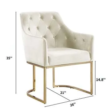 Show more Experience the perfect blend of elegance and comfort with our stunning velvet accent chair. Crafted with high-quality materials, the chair features a unique back design that is beautifully complemented by tufted buttons, offering a touch of classic sophistication to any room. Its luxurious skin-friendly velvet upholstery appeals to the senses, ensuring a delightful sitting experience. The chic armchair is structured with a stylish stainless-steel U-shape frame that provides both stability and a striking visual appeal.