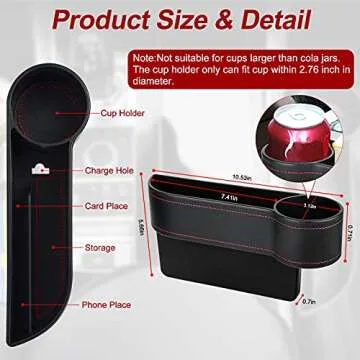| warranty | 30-DAY full replacement warranty. Not suitable for the car seat gaps wider than 0.6 inches(1.5 cm) and central console lower than the seat. The size of the Car Seat Gap Filler with Cup Holder is 10.53"L x 3.12"W x 5.66"H which is suitable for most car truck suv. The cup holder can fit cups up to 2.6 inches in diameter. Please measure the distance between your seat and the console carefully before you purchase it. |