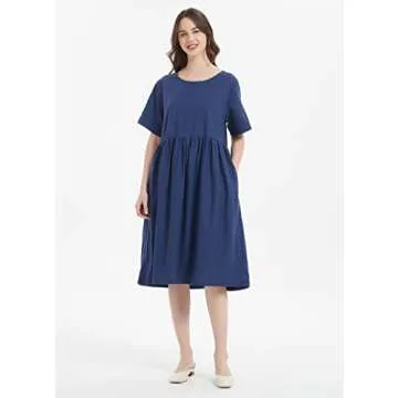 Show moreExperience Comfort and Style with Mordenmiss Women's Cotton Linen Dress - the ultimate summer midi dress that blends elegance with ease. Crafted from a lightweight cotton-linen blend, this short sleeve dress guarantees breathability and comfort during those warm summer days. Featuring a classy round neck and a chic knee-length cut, this dress exudes a relaxed vibe. The loose pleated empire waist not only ensures a flattering silhouette but also provides the comfort of an oversized fit. Perfect for casual outings or semi-formal occasions, this dress is designed with practicality in mind, showcasing two convenient side pockets for added functionality. Choose from a delightful palette of six colors to express your unique sense of style, and stand out with this staple piece in your wardrobe. It's available in sizes M, L, XL, and 2XL, catering to various body types, so every woman can embrace her beauty with confidence.