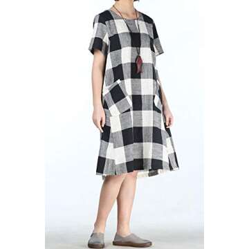 Show moreIntroducing the Mordenmiss Women's Plaid Linen Dresses Short Sleeve Flannel Tunic Dress, the epitome of comfort and style for the modern woman. Crafted from a light cotton linen blend, this elegant midi dress is designed to keep you cool and stylish during the warmer months. The dress features a classic round neck and short sleeves, combining a timeless silhouette with practicality. Two spacious side pockets enhance functionality, allowing you to keep your essentials close at hand, whether you're heading to brunch or out for a casual day of shopping.