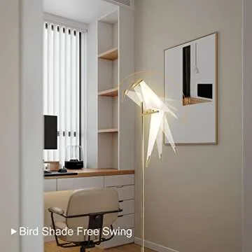 Show more Elevate your living space with the MORE CHANGE 62-Inch Modern LED Bird Floor Lamp, an exquisite fusion of functionality and charm. This stylish lamp not only serves as an essential light source but also adds an enchanting accent to your home decor. Crafted with an environmentally friendly PP shade that allows for beautiful light transmission, this lamp ensures a warm, soft glow that is easy on the eyes while illuminating your room evenly. The unique bird-shaped design not only captivates attention but also creates a whimsical atmosphere that makes it the perfect lighting solution for modern homes.