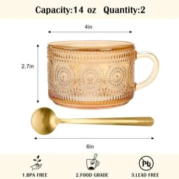 The mugs are crafted from high-quality, sustainable clear glass, ensuring durability and style. Their large 14 oz capacity is perfect for enjoying a variety of beverages—from hot coffee to refreshing iced teas or even cereal and smoothies. Not only are these mugs functional, but they also serve as beautiful decor items, bringing a sense of nostalgia and elegance to your dining experience.