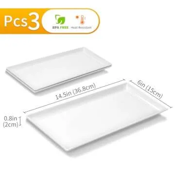 Show moreIntroducing the Moretoes 3pcs White Serving Platters, the perfect combination of functionality and style for your culinary presentations. Crafted with a generous dimension of 14.5"L x 6.0"W x 0.8"H, these rectangular trays are versatile enough to hold an extensive array of dishes—from appetizers and sushi to desserts and main courses. Made from premium melamine, these platters provide a beautiful porcelain-like appearance while standing strong against the rigors of frequent use. They are designed not to crack or break, ensuring they serve you well for years to come.